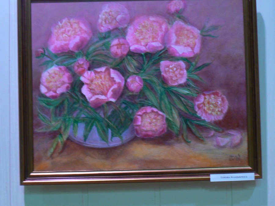 Wystawa zgromadziła liczne grono zwiedzających. Byli wśród nich studenci UTW - członkowie programu BASE, siostrzana grupa malarska „Kolor” i zaproszeni goście. Wszyscy podziwiali prace, a było ich dużo, bo ponad 60! Tematyka prac różnorodna: obrazy martwej natury, pejzaże, kwiaty, ptaki, abstrakcje i portrety. Przeważały obrazy malowane techniką olejną lecz były też pastele i rysunki. Z wielkim pietyzmem malarskim były oddane owoce i naczynia w martwych naturach /E.Borowska, B.Mroczkowska, W.Skąpska, T. Waszkiewicz, J. i A.Jakoniukowie, J Kisielewska/, kwiaty w naturze i w wazonach / E.Borowska, M. Falkowska, J.Jakoniuk, H.Okońska/, różne rodzaje ptaków /M.Falkowska, A.Paszkiewicz-Gadek/, pejzaże /B.Mroczkowska,A.Paszkiewicz-Gadek, J.Sidoruk, /, architektura /H.Okońska, T.Waszkiewicz/. Dużym zainteresowaniem cieszyły się portrety malowane suchą pastelą przez kol J.Petrusewicz. Kolorystyką i śmiałością wyrazu charakteryzowały się prace abstrakcyjne Z. Gieleżyńskiej. Myślę żekażdy znalazł na tej wystawie jakąś pracę którą chciałby mieć, albo która mu zapadła w pamięci na dłużej.