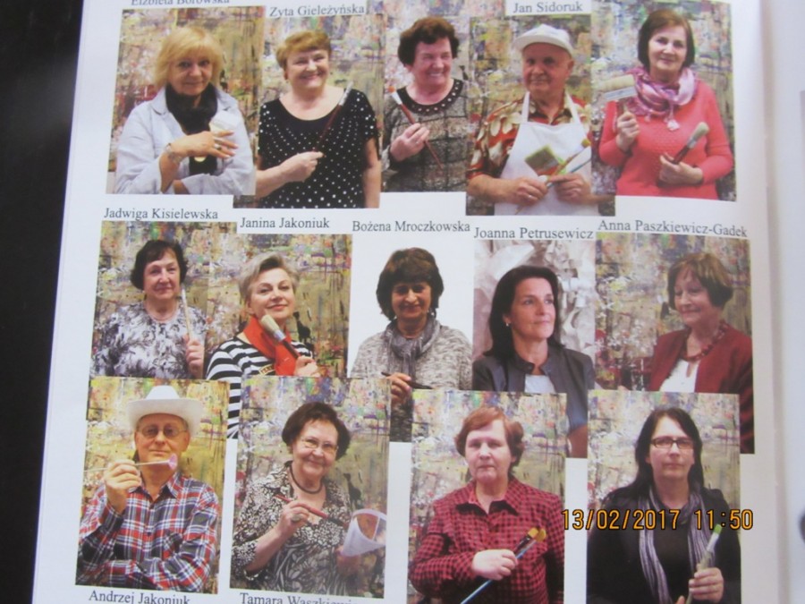 W dniach 11 -31.03.16 zorganizowaliśmy w SPODK-ach wystawę zbiorową prac naszych seniorów pt. „Po horyzont”. Również w SPODK-ach, w dn. 12.VII - 3.IX, były prezentowane nasze prace na wystawie "Obrazy zapamiętane" w ramach Przeglądu Twórczości Artystów–Amatorów z woj. podlaskiego, Zostały wówczas wyróżnione prace naszych koleżanek: Elżbiety Borowskiej i Janiny Jakoniuk. Następna planowana na jesień wystawa odbyła się 28.stycznia 2017 r. w klubie „Kalina” na ul. Kalinowej i można ją oglądać do wakacji 2017r.. Na tej wystawie nasza koleżanka J. Jakoniuk recytowała swoje wiersze przy akompaniamencie muzycznym Andrzeja Mazura. Poza tym dwie osoby z naszej grupy /E. Borowska i J. Petrusewicz/ brały udział w plenerze malarskim zorganizowanym przez WOAK w Przewięzi w dniach 08-17.VIII i potem w poplenerowej wystawie. Koleżanka J. Jakoniuk zorganizowała również wieczorek poetycko-muzyczny na którym prezentowała swoje obrazy i wiersze w dn. 9.XI. w klubie „Moteory” na ul. Dobrej.