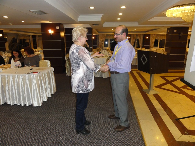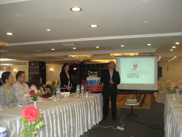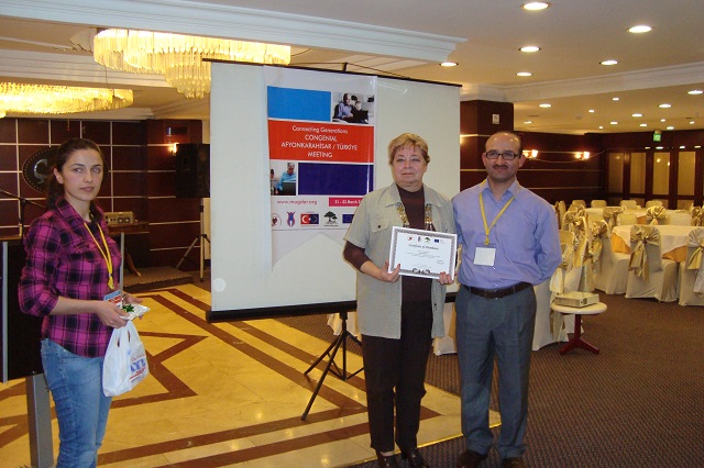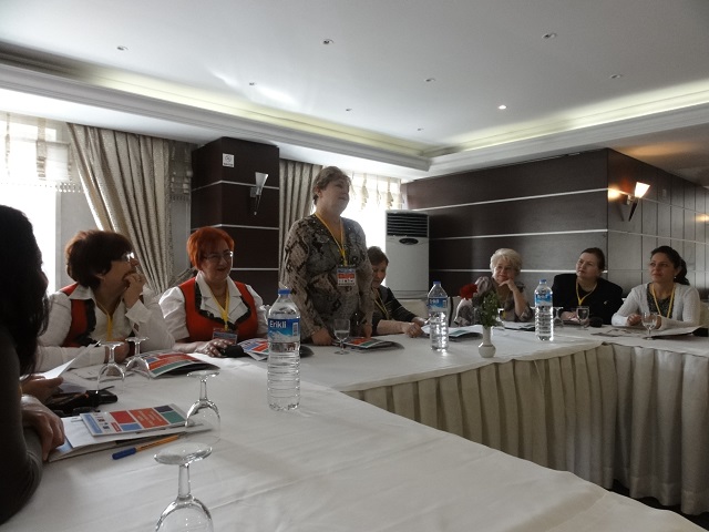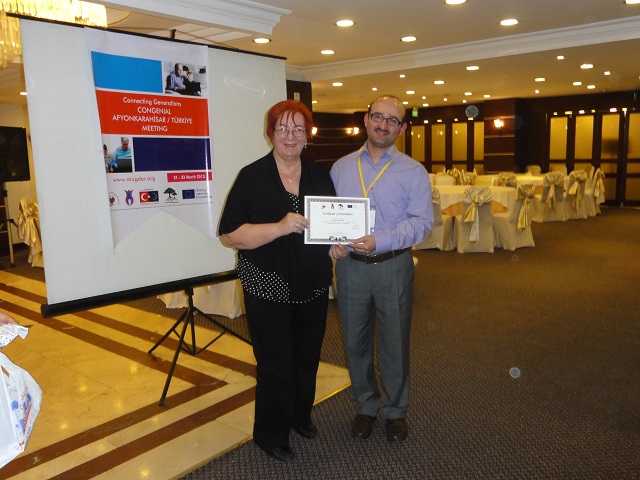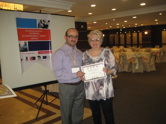 Po nocnym odpoczynku i śniadaniu, zaproszono nas do sali konferencyjnej hotelu na spotkanie z uczestnikami projektu. Gospodarz Abdurrahman GUNAY przywitał gości, zapoznał z programem spotkania, po czym , przy stołach ustawionych w podkowę nastąpiła prezentacja poszczególnych grup : Turcja 8-osób, Grecja 2-wie osoby , Polska – 5, Rumunia - 4 , Włochy -3, Węgry-2-wie osoby .W większości byli to młodzi ludzie i nie każda grupa miała koordynatora. Tu tym bardziej doceniłyśmy Danutę Sajur, że z nami była. Danusia z Walentyną wręczyły upominki organizatorom spotkania, my zaś ja i Jadwiga Łuckiewicz wraz z młodą Turczynką zaśpiewałyśmy „Odę do seniorów” i ludową naszą piosenkę. Następnie obejrzeliśmy interesującą prezentację komputerową o Afyon i regionie, a także o działalności organizacji pozarządowych, przedstawioną przez młodą reprezentantkę gospodarzy - Ajszę.
