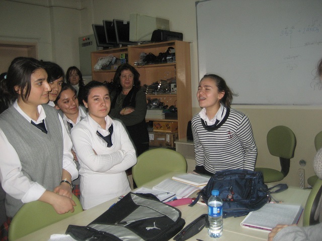 Następny dzień pobytu w Afyon przywitał nas nieciekawą pogodą. Przydały się nam nasze kurtki i czapki i rękawiczki. Po śniadaniu pojechaliśmy lokalnym autobusem na spotkanie z młodzieżą do szkoły zawodowej. Trochę onieśmieleni wchodziliśmy na teren szkoły, gdzie zobaczyliśmy dziewczyny w jednakowych mundurkach. Przedstawiciel szkoły przywitał nas bardzo serdecznie i zaprosił do wnętrza. Abdurrahman w każdej z klas opowiadał o programie Congenial. Zaś nauczyciele z uśmiechem i wyczerpująco mówili o danej specjalności. Ponieważ uczniowie maja w programie język angielski, nie było większego problemu w nawiązaniu kontaktu z nimi. Jednak ich przyjazny stosunek do nas bardziej się przejawiał, gdy zaczynałam śpiewać po turecku, krótką piosenkę o zmarzniętym ptaszku.: