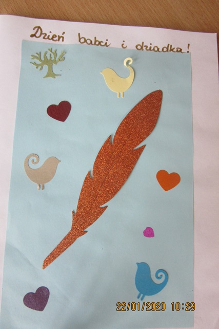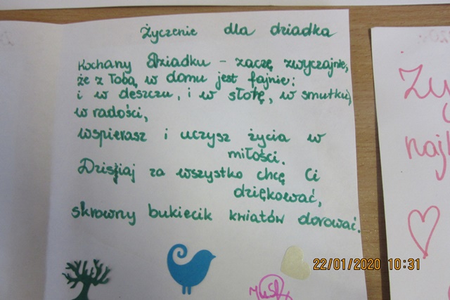 Dzieci samodzielnie przygotowały na tę okoliczność laurki dla Seniorów oraz sałatkę owocową. Laurki zawierały wierszyki, rymowanki oraz piękne ozdoby i obdarowywały nimi „przyszywane” babcie i dziadków z naszego projektu. Spotkanie przepojone było sympatią i miłością /życzenia, śpiewy, konsumpcja sałatki,/ oraz sprawiło wiele radości i wzruszeń obu stronom.