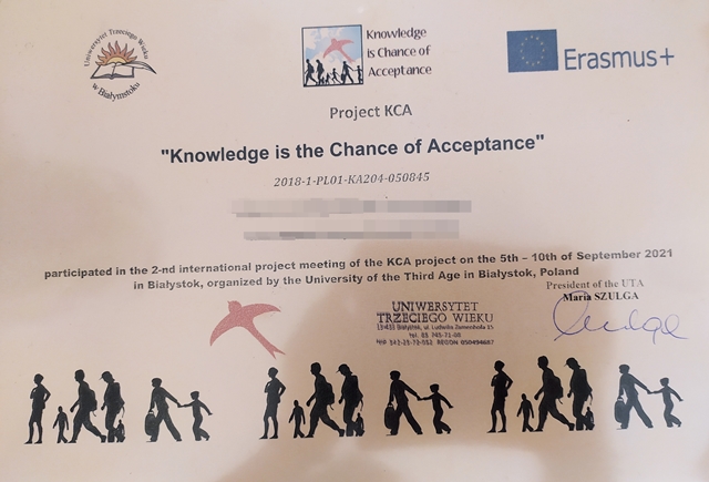 1. Opis międzynarodowego spotkania edukacyjnego w Białymstoku pt. "Problemy Polski i krajów partnerów z powodu ostatniej fali uchodźczej do Europy" zorganizowanego w ramach projektu Erasmus + pt. "Wiedza jest szansą akceptacji (w skrócie KCA) w dniach /04 - 12.09. 2021/