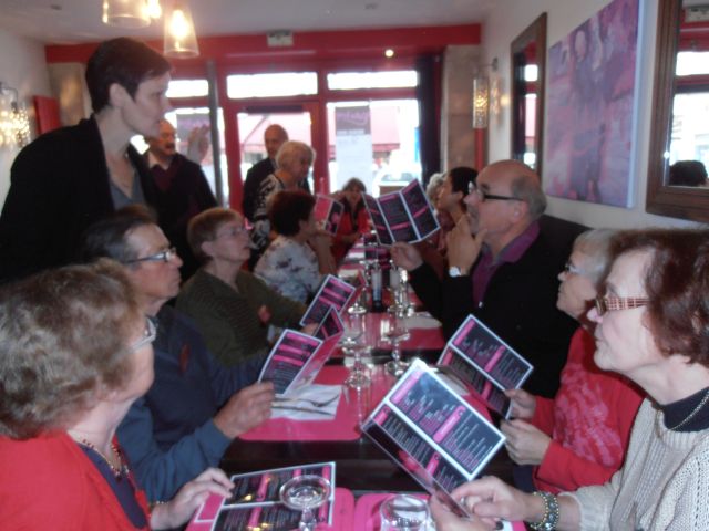 Na lotnisko w Warszawie dojechałyśmy autobusem „Podlaski Express”.W automatach wydrukowaliśmy bilety, oddałyśmy bagaż, po poddaniu się kontroli celnej o godz.12:40 samolotem linii Air France odleciałyśmy do Paryża. O godz. 15:05 szczęśliwie wylądowałyśmy i udałyśmy się w dalszą drogę, pociągiem a następnie metrem i około godz. 17 dotarliśmy do Hotelu Saint Sebastian. O godz.20:30 w Restauracji „Bistrot Amelot „ niedaleko naszego hotelu spotkałyśmy się z partnerami projektu na wspólnej kolacji. Przybyłych gości przywitał Erez Levy główny koordynator projektu z Centre Medem – Arbeter Ring Francja. Przedstawił szczegółowo program wizyty edukacyjnej, wskazał osoby odpowiedzialne z Centre Medem za poszczególnych partnerów podczas warsztatów oraz krótko przedstawił zarys historii dzielnicy Paryża Marais, którą mieliśmy zwiedzać trzeciego dnia pobytu. Menu kolacji : ryba faszerowana /przystawka/, kurczak z ryżem i surówkami a na deser przepyszne gruszki w czekoladzie, no oczywiście wino. Podczas kolacji, w przerwach pomiędzy posiłkami wszyscy świetnie bawiliśmy się, śpiewając kolejno pieśni biesiadne najbardziej popularne w swoich krajach. Oczywiście dominowały piosenki polskie a intonowała je pięknie Danusia Łada.