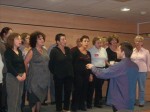 Około godz. 19.00 tego dnia pojechaliśmy autobusem na kolację do pizzerii. Podczas kolacji odbyła się uroczystość podziękowań partnerów i wręczenie upominków. Nasza koleżanka Danusia Łopatecka wręczyła włoskiej koordynatorce projektu Marinie Mecarelli obraz własnoręcznie przez siebie wykonany oraz ażurowe piękne serwetki ozdobne. Polska grupa wręczyła również drobne upominki innym włoskim organizatorom. Na koniec Helena wręczyła obrazek własnoręcznie wyhaftowany przez Barbarę Wilczewską głównemu koordynatorowi projektu Erezowi Levi. Drugi taki wyhaftowany obrazek wręczyliśmy jednej z Francuzek Chantal, która bardzo serdecznie opiekowała się naszą grupą w Paryżu.